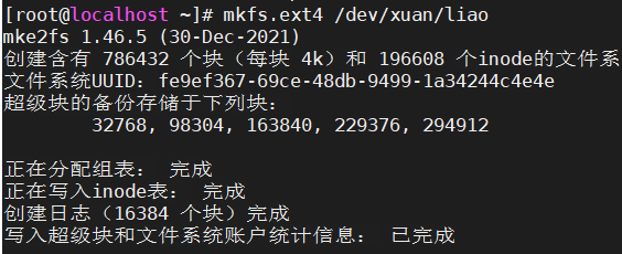 mkfs.ext4 /dev/xuan/liao