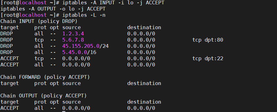 [root@localhost ~]# iptables -P OUTPUT ACCEPT