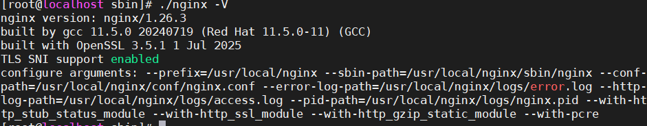 执行以下命令显示安装的Nginx版本和相关编译信息: