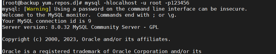 root@backup yum.repos.d]# mysql -hlocalhost -u root -p123456 #如下图