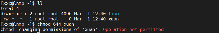 原因:Linux 权限模型中,只有文件所有者或 root 才能修改文件权限,如下图: