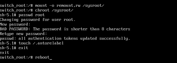 3)、强制 SELinux 重新标记: 这是最关键的一步! 如果启用了selinux,不执行此步骤,重启后新密码将失效,且可能无法进入系统: