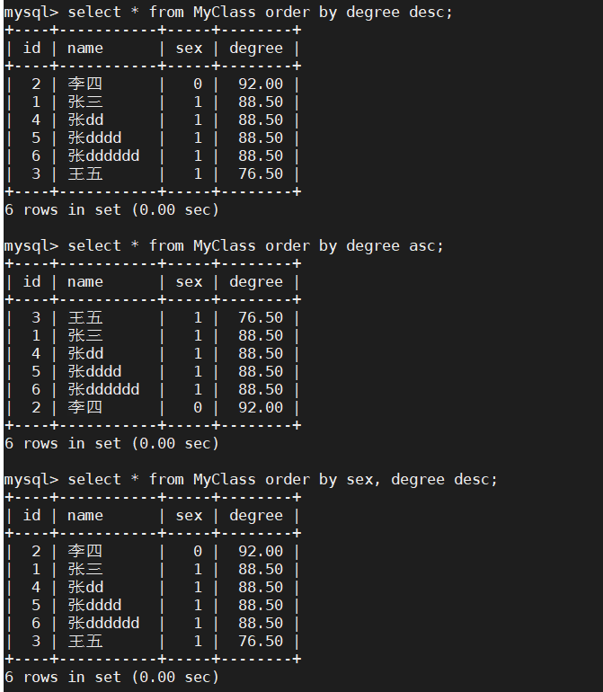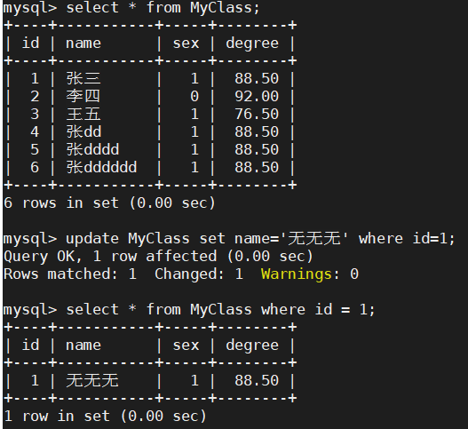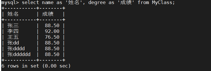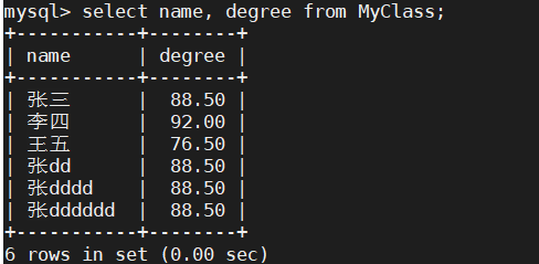 mysql> insert into MyClass values ('张三', 1, 88.5);