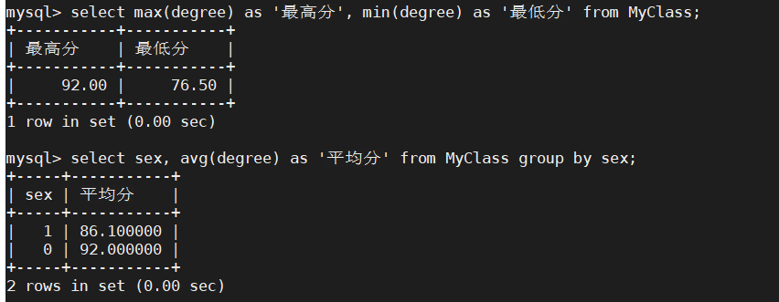 select max(degree) as '最高分', min(degree) as '最低分' from MyClass;