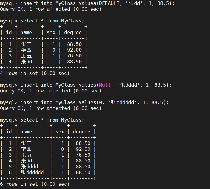 insert into MyClass values(DEFAULT, '张三', 1, 88.5);
