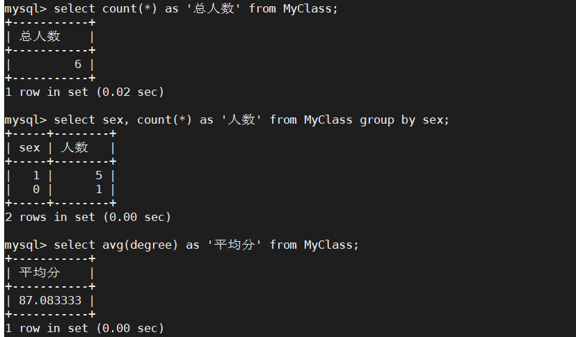 select sex, avg(degree) as '平均分' from MyClass group by sex;
