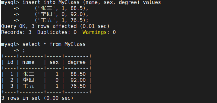 insert into MyClass (name, sex, degree) values ('张三', 1, 88.5);
